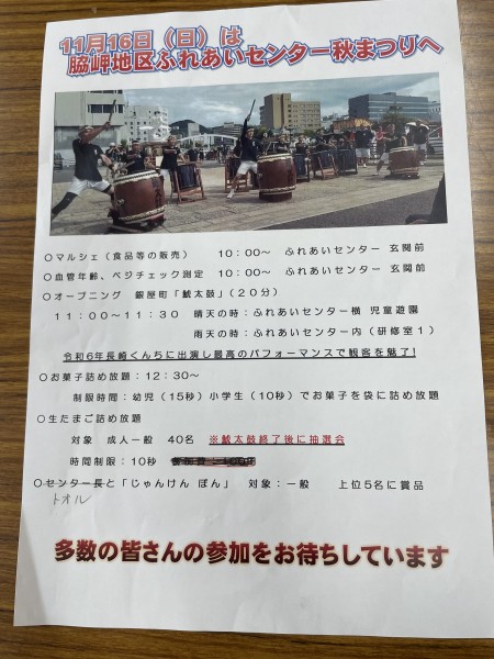 11/16(日)は近くの地域センター(旧脇岬公民館)にてイベント出店になります。